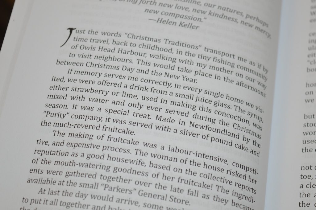 Joyce Baxter read part of her Christmas Traditions Piece: Reminiscing about Christmas Traditions found in An Evergreen Christmas. Joyce grew up in the 1940s in a small fishing community of Owl’s Head Harbour. Joyce brought a no-sugar, egg-free, and fat-free fruitcake made from a recipe she contributed to the book, and strawberry “Purity” syrup, made in Newfoundland, which is only available this time of year at Sobey’s.