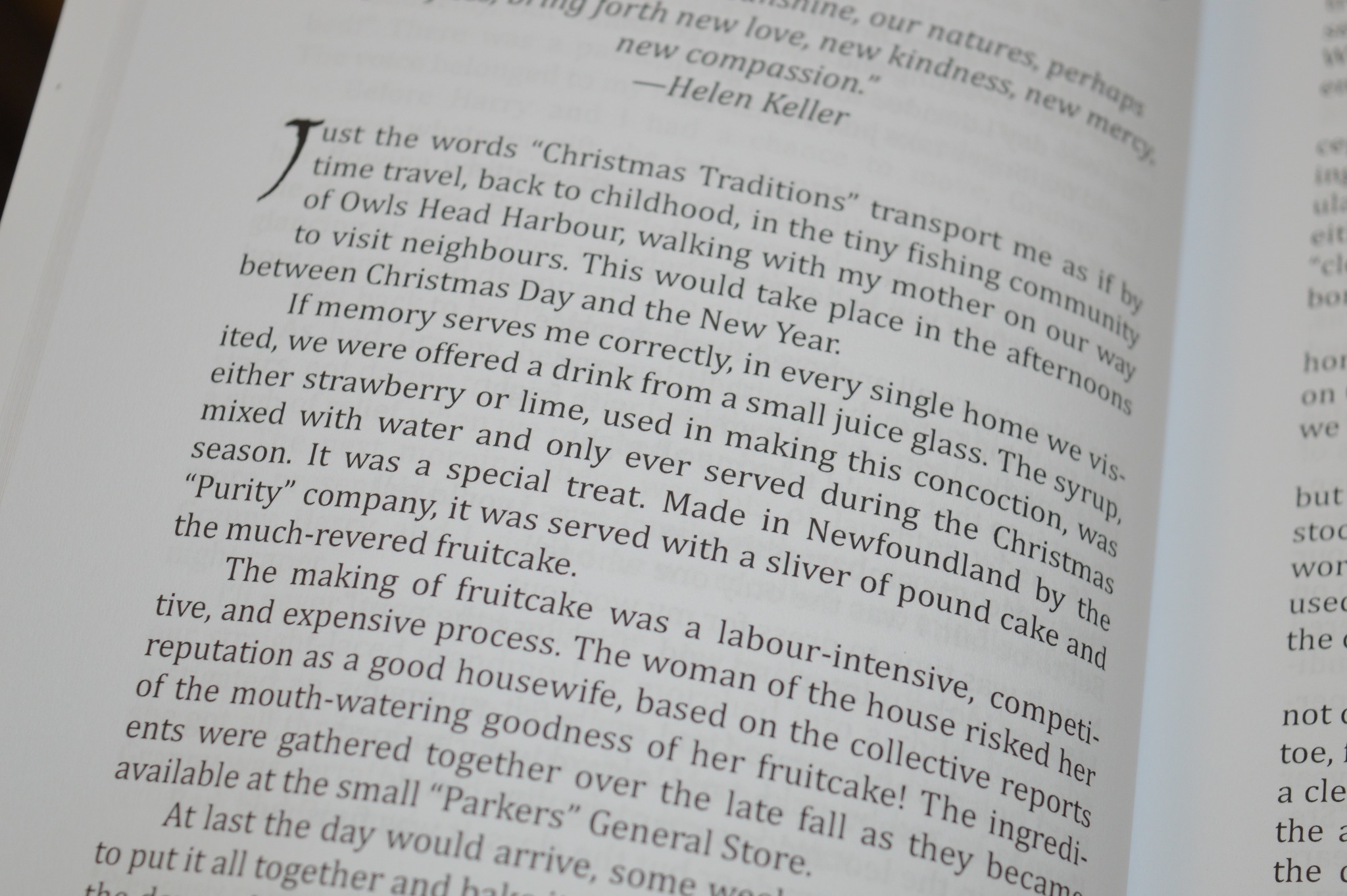 “The making of fruitcake was a labour-intensive, expensive, and competitive process. The woman of the house risked her reputation as a good housewife, based on the collective reports of the mouth-watering goodness of her fruitcake.”– An Evergreen Christmas, page 12, Reminiscing about Christmas Traditions by Joyce Baxter.