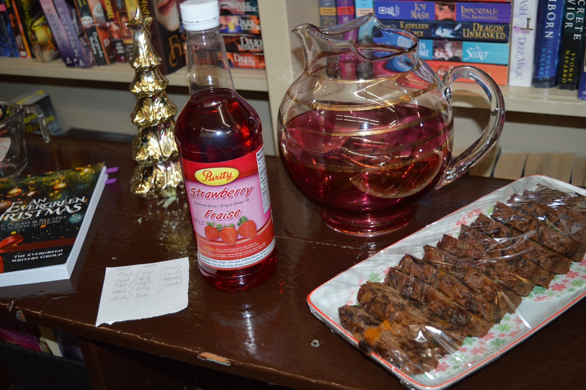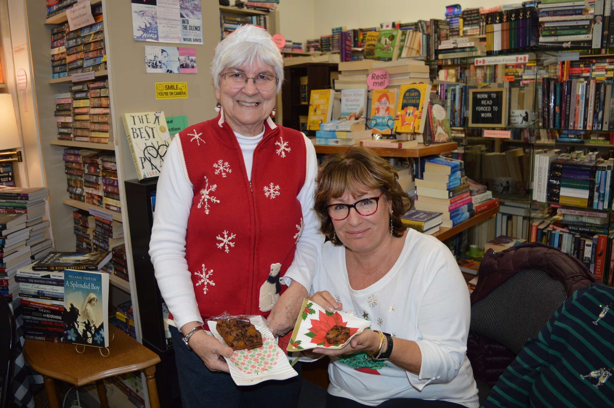 Joyce Baxter read part of her Christmas Traditions Piece: Reminiscing about Christmas Traditions found in An Evergreen Christmas. Joyce grew up in the 1940s in a small fishing community of Owl’s Head Harbour. Joyce brought a no-sugar, egg-free, and fat-free fruitcake made from a recipe she contributed to the book, and strawberry “Purity” syrup, made in Newfoundland, which is only available this time of year at Sobey’s.