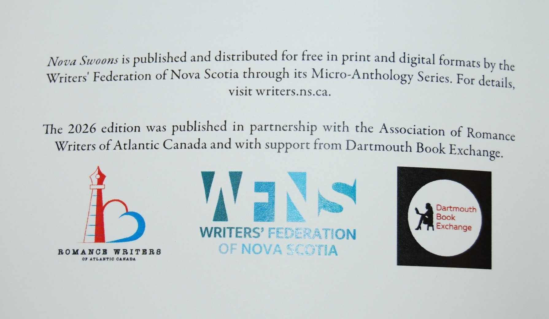 Nova Swoons 2026 is part of the Writers’ Federation (WFNS) Micro-anthology series that “provides publication opportunities and encourages Nova Scotia readers to discover local authors.” The 2026 edition was published in partnership with Romance Writers of Atlantic Canada (RWAC) with the support of Dartmouth Book Exchange.